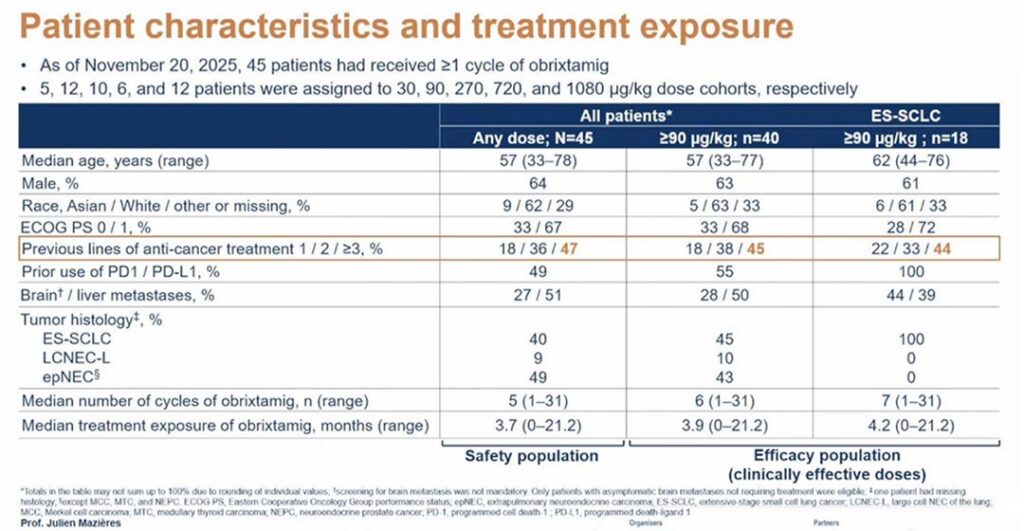 As of November 20, 2025, 45 patients had received at least one cycle of obrixtamig; 40 patients had received a clinically effective dose (defined as 90 µg/kg or more), including 18 with extensive-stage (ES) SCLC.