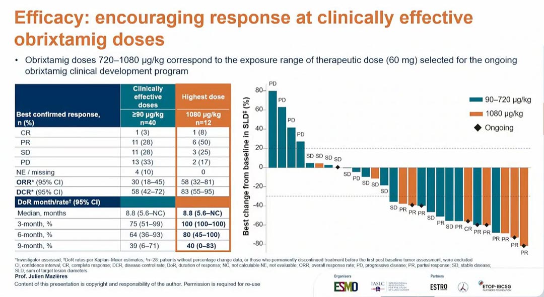 “If we focus on doses of 90 µg/kg or more, the ORR was 30%, and the DCR was 58%,” Dr. Mazières said. “If we focus on the highest dose, 1,080 µg/kg, you can see that the ORR reached 58% and the DCR was 83%.”
