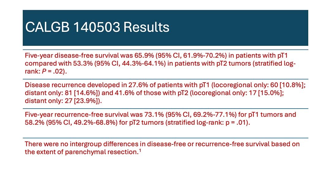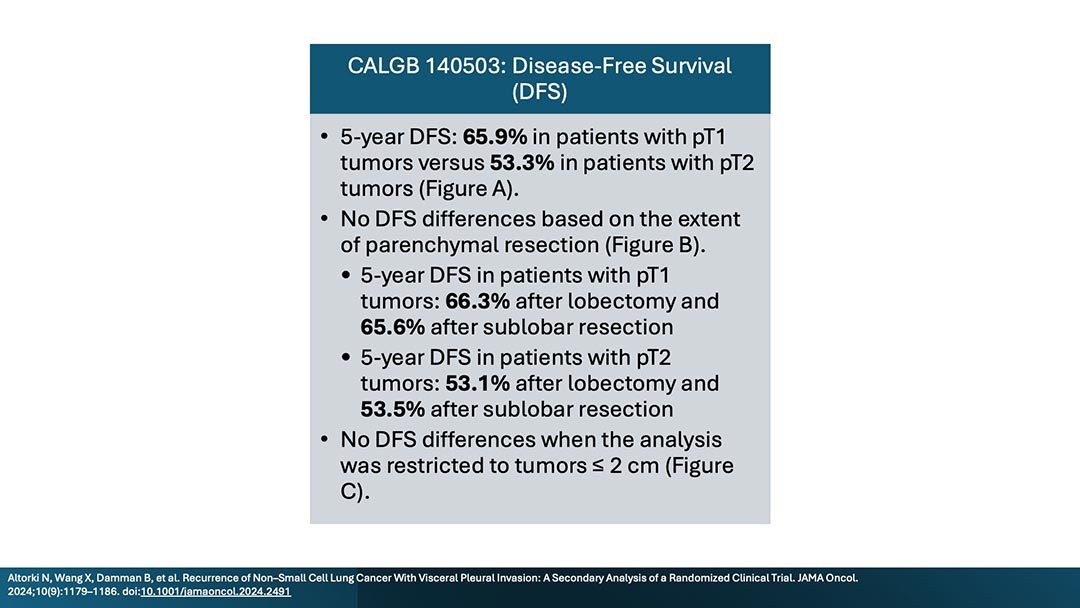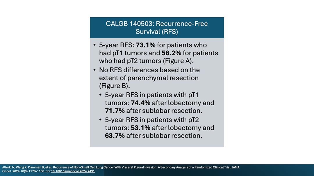 A secondary analysis of the randomized clinical trial Cancer and Leukemia Group B (CALGB) 140503 investigated oncologic outcomes in patients with non-small cell lung cancer (NSCLC) who had visceral pleural invasion (VPI) following lobar or sublobar resection.1