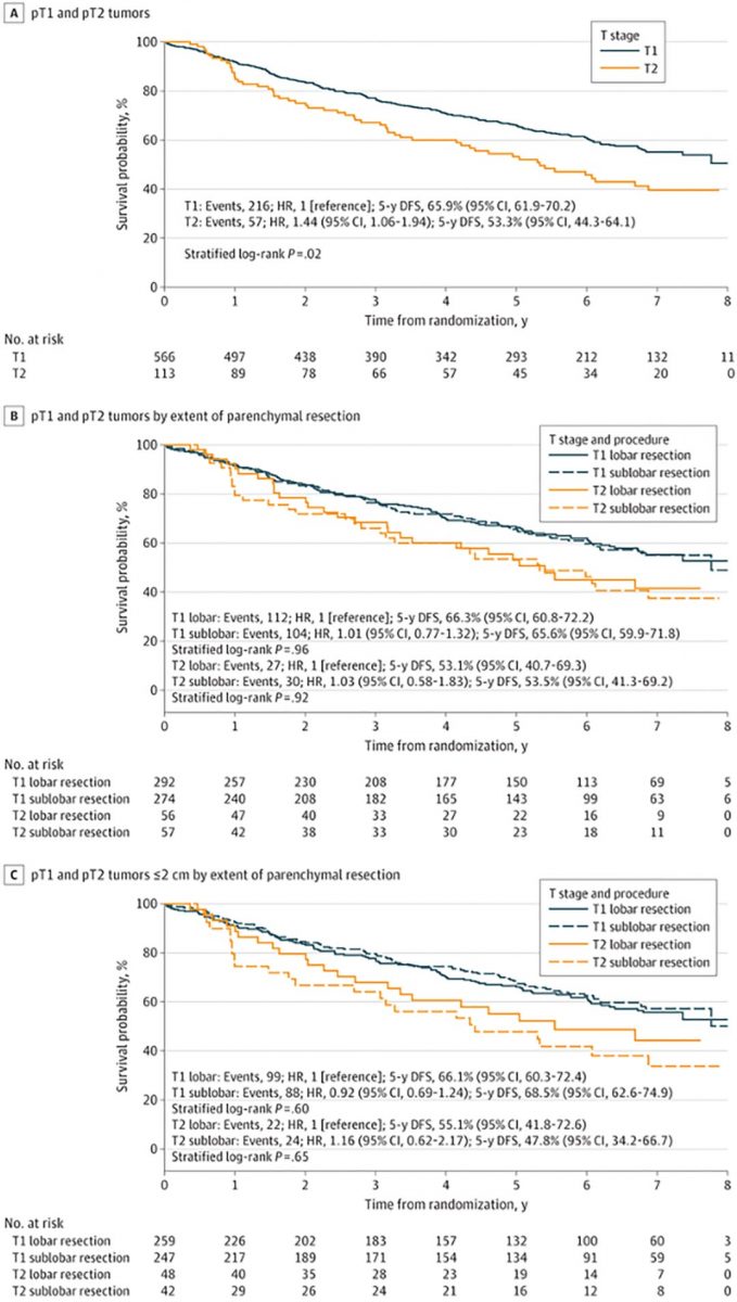 The analysis of the T2 tumor subgroup showed no difference in disease-free survival (DFS) between patients who had lobectomy and segmentectomy, suggesting that both lobar and sublobar resection are equal.