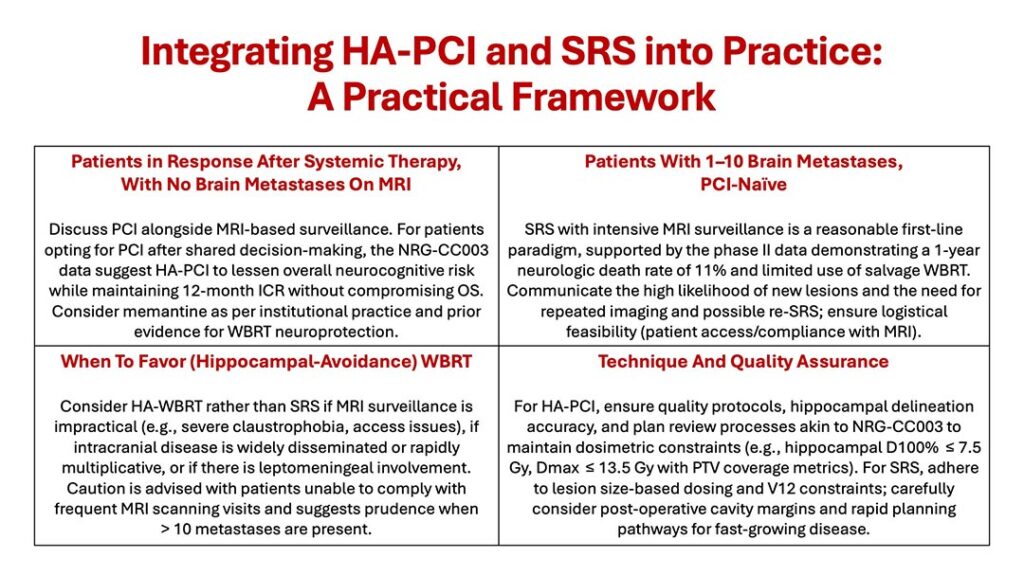 Second, biomarkers of neurocognitive susceptibility and of CNS metastatic propensity could refine selection for HA-PCI versus surveillance or SRS versus HA-WBRT. Finally, pragmatic research on surveillance intensity, patient-reported outcomes, and health-system logistics (MRI access, rapid salvage capacity) will determine the real-world success of brain-sparing strategies.